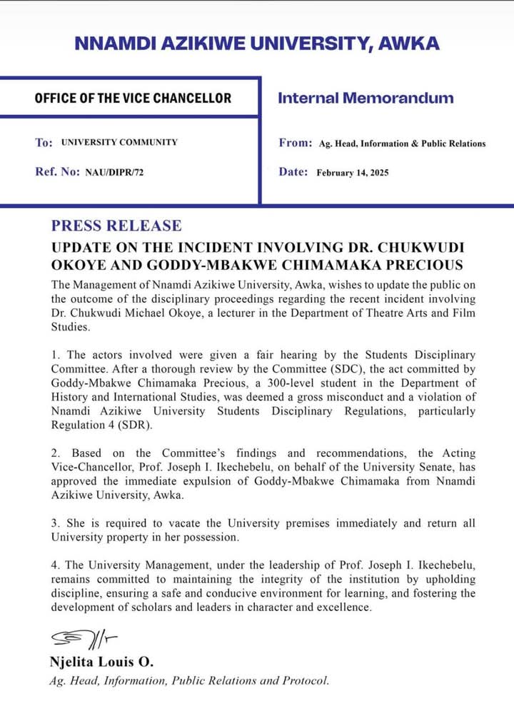 The management of Nnamdi Azikiwe University (UNIZIK) has expelled a student named Goddy Mbakwe Chiamaka Precious, a 300-Level student from the Department of History and International Studies over assault on one of her Lecturers.