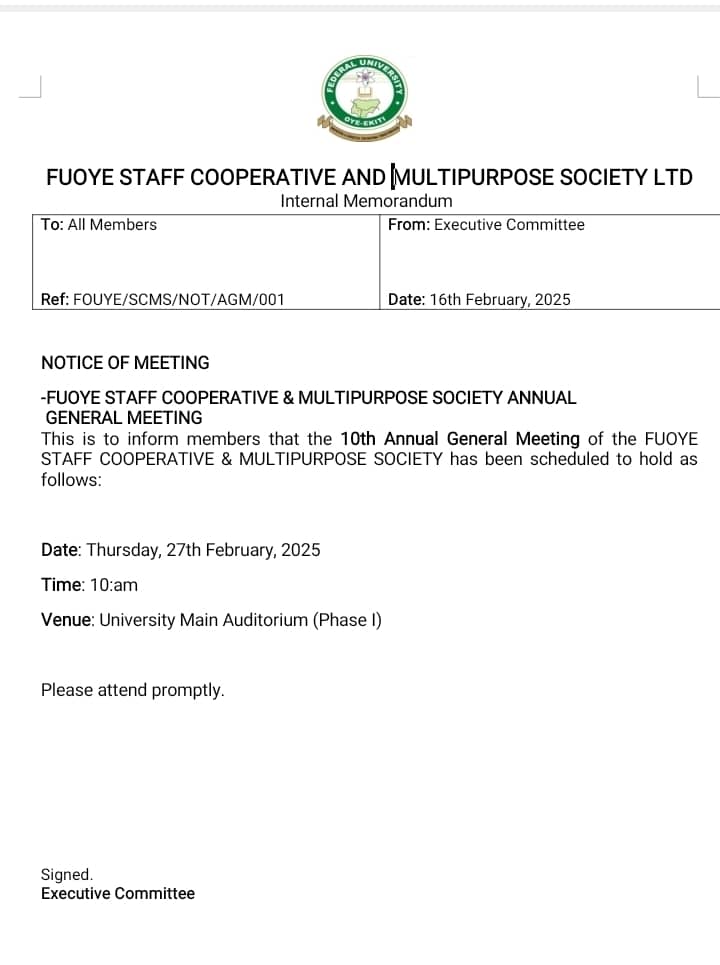Staff cooperative and Multipurpose Society of the Federal University Oye-Ekiti (FUOYE), Ekiti State, Nigeria will hold its Annual General Meeting (AGM) on Thursday, February 27, 2025, at the Main Auditorium of the university.
